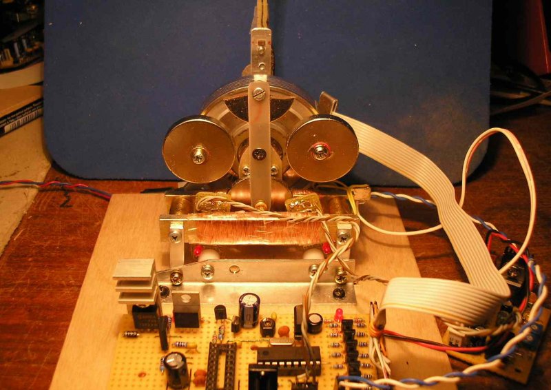 Így is van! Kiegyensúlyozva a forgástengelyre a kar és lengőmágnes, (mérlegelv szerint), egyéltalán nem okoz rezonálást, ill. nem érvényesülhet a csapágy komolyabb terhelése sem. A H-hid 130mA/7V, amit felvesz ennél a lengési frekvenciánál. Annyira zajtalan a működése, hogy az már tényleg egy komoly előrelépés a megoldásokban. - Úgy látom, nem igazán nyerte el a tetszését senkinek ez a Wand mechanika ezzel a videó-fejdob és mágnesgyűrűk alkalmazásával, ezért én is befejezem itt az ezzel kapcsolatos kisérleteimet. Ha megjönnek az újabb mágnesek, talán akkor veszem elő ismét. A végére még néhány kép egyirányú vezérlővel befejezésül.