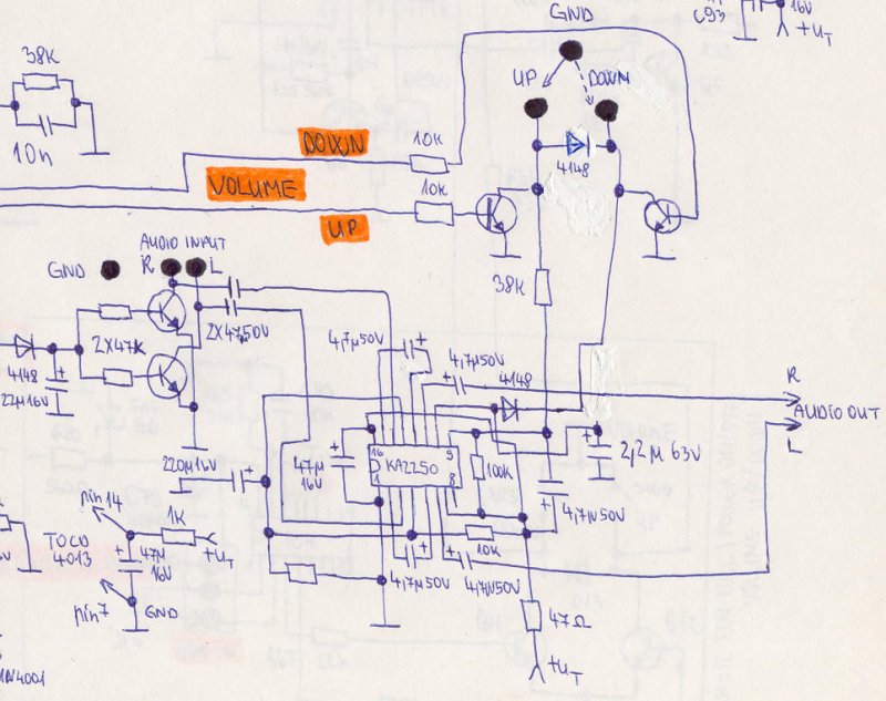 Nah szóval akkor a rajz amit igértem. A hanegerőszabályozást a TC9153 (samsung megfelelője KA2250) valósitja meg az adatlapjában is szereplő kapcsolásban.Ezt a rajzot én úgy fejtettem vissza a nyák vezető sávjaiból .A nyomógombok az up és down reszekhez csatlakoznak ugy hogy hang le vagy felszabályozáskor a gnd-vel záródnak, nem is kapcsolók hanem nyomógombok ezek . A tranyokat az infravevő megfelelő lábai vezérlik.