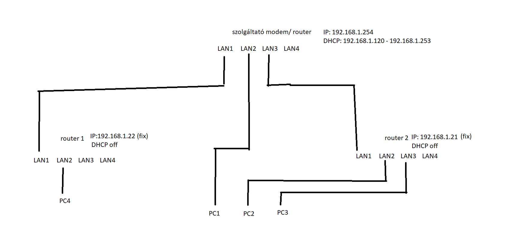 Az alábbi módon van a hálózat összeállítva (kép) Nyilván vannak más eszközök is vannak a hálózaton (beltérik, tv-k), de így mindenhol van net, a routerek WAN portjai üresek. Mindkét router gateway-e és DNS-e 192.168.1.254 (fő router IP-je)