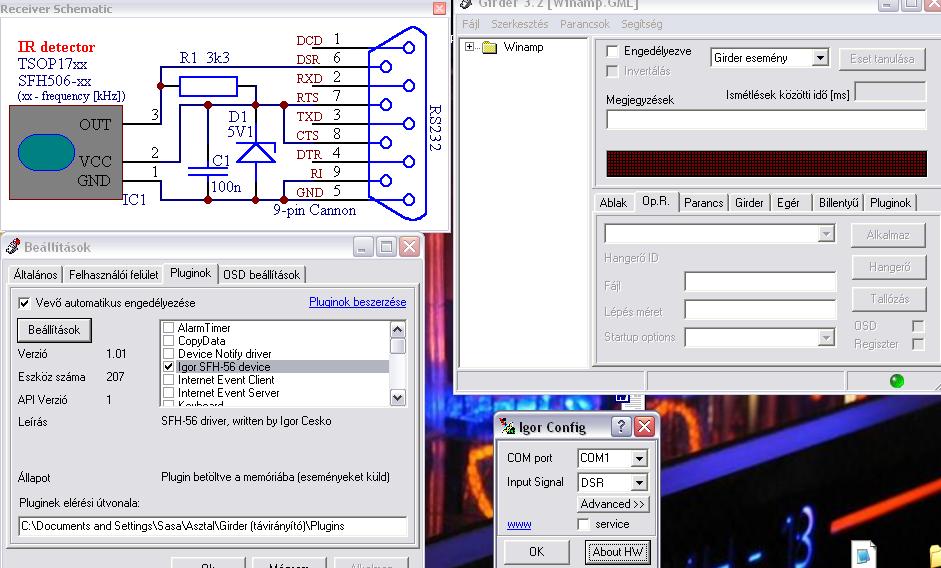 Én egy Girder nevű programot használok erre. COM porton a géphez kell kötni egy IR vevőt és bármilyen távirányítóval tudod vezérelni a gépet, és természeresen a winampot is. A programot egyben nem tudom feltölteni, mert 3,5Mb, de bárhonnan le tudod szedni. A képen a HW és a beállítások vannak. Ha valami nem tiszta kérdezz nyugodtan.
