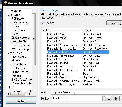 /Winamp beállítása: Preferences/Global Hotkeys/Enabled meletti négyzetben pipa/