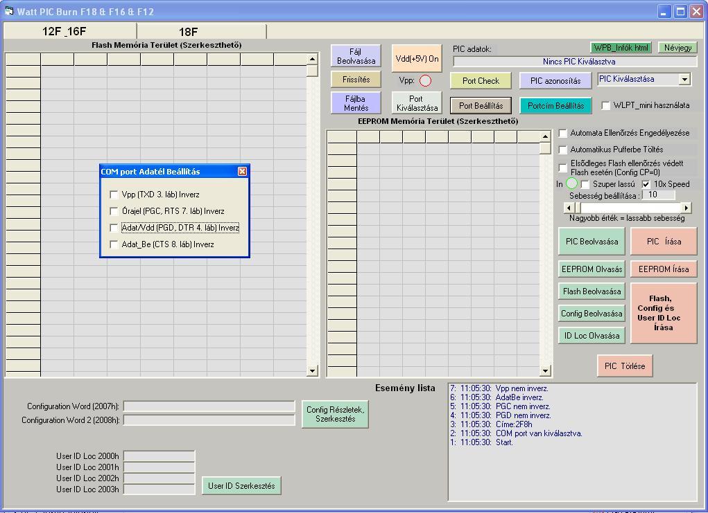 Hello, watt egyébként nagyszerű fejlesztéséhez lenne kérdésem, 12F683-mal nem akar menni a WPB program (v1.23-tól már elvileg szerepel benne, több verziót is próbáltam, ugyanazzal az eredménnyel). WLPT mini v4 csatolóval próbálom. A vezetékezésem nem lehet annyira rossz, mert 12F629-et sikerül programozni. A 683-mal viszont már a felismerésnél baj van, mert 16F683-nak ismeri fel (16 vs. 12). 2 db-ot egyformán, két külön xp-s gépen. Az Epromot tudja írni, de a flash memóriát már nem. Mindjárt a második byte-nál leakad.