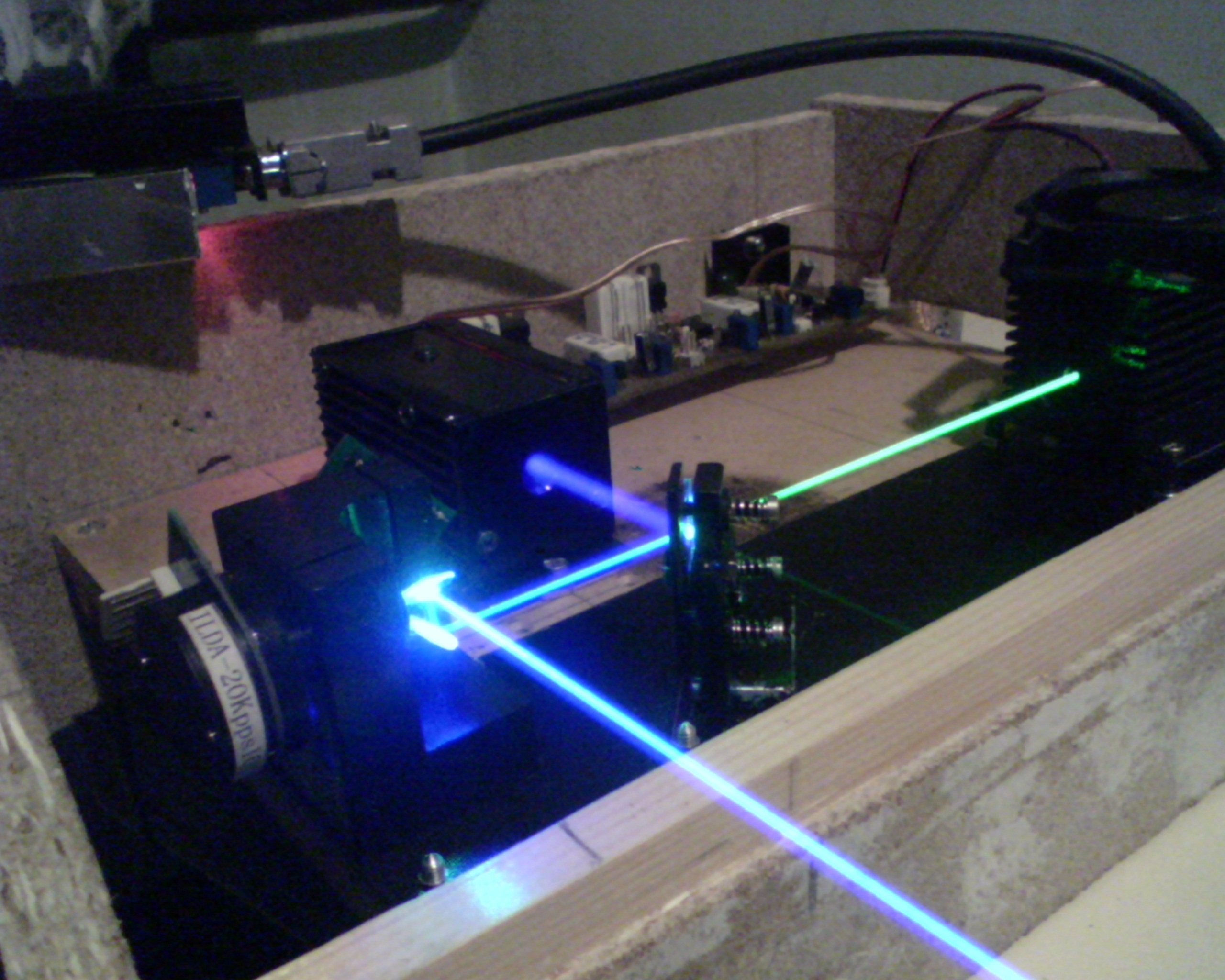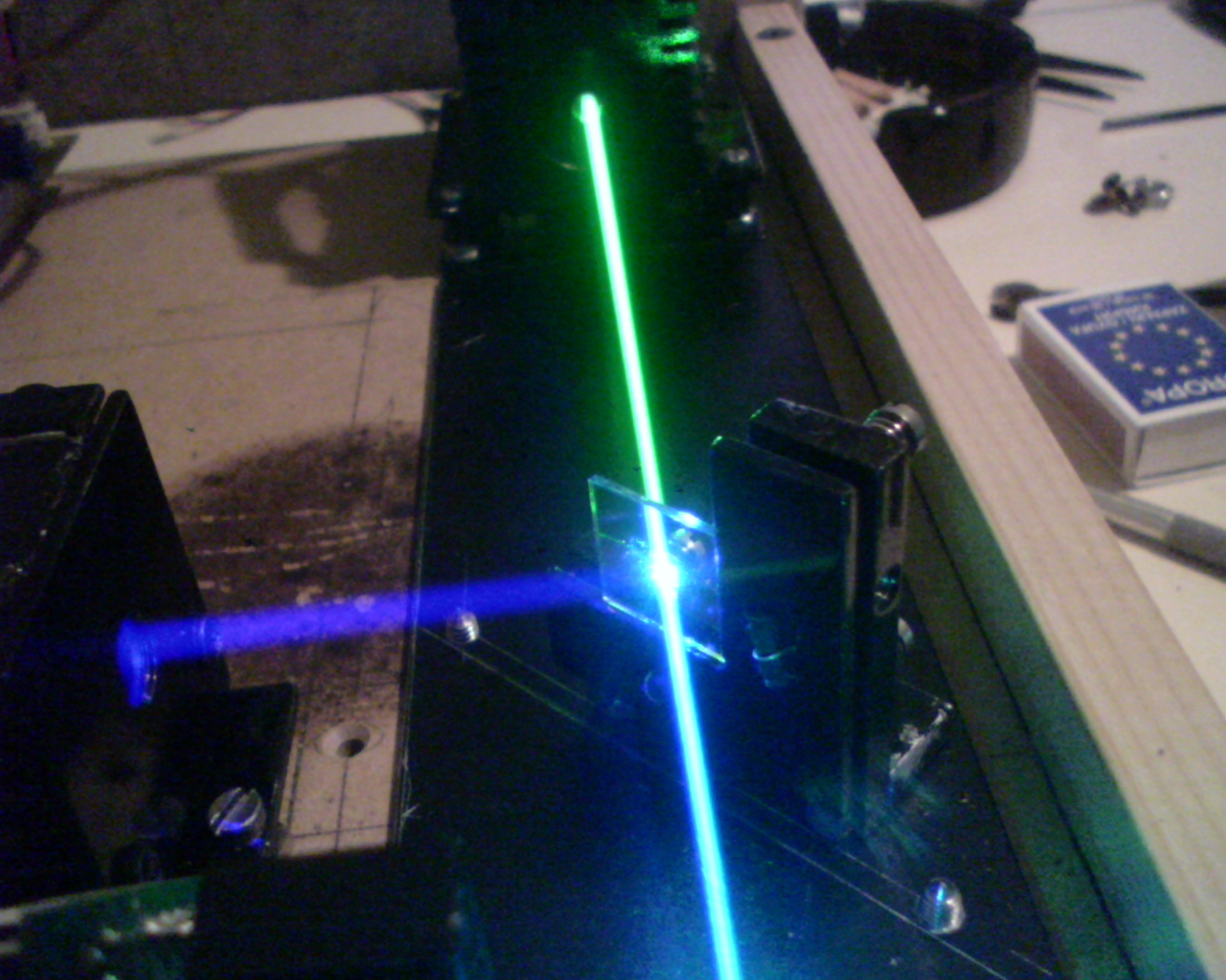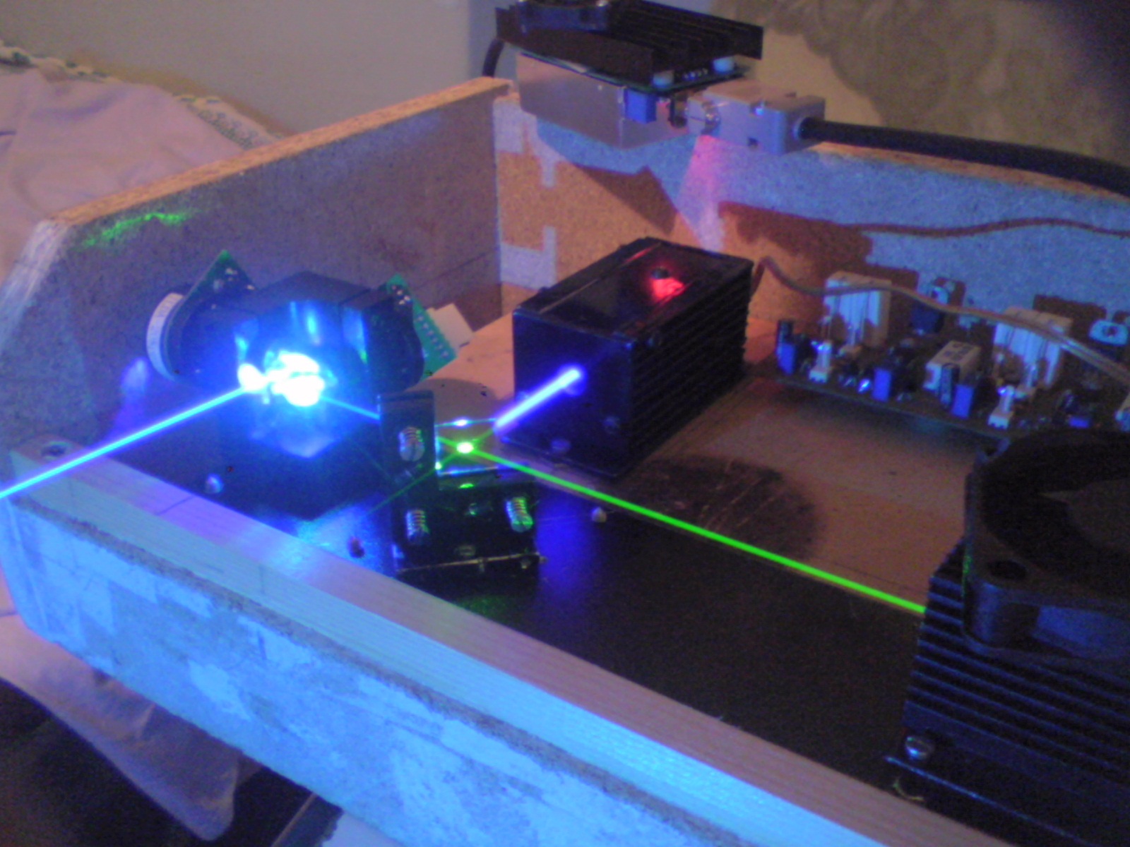 Lassan de biztosan én is haladok. Persze mindig van valami bénázás ami visszaveti a munkát. A tekercselés annyira nem jött össze, mert a lakkozással együtt bent ragadt a sablonban De holnapra elkészül a másik sablon és akkor kezdődhet újra. Tegnap megöltem egy piros diódát és egy dupla áramgenerátort mert nem vettem észre, hogy egy hibás forrasztás elengedett és rövidzárlatot okozott. Viszont felragasztottam a dichrokat és gyorsan csináltam egy "cián" sugarat a lila és zöld lézerrel.