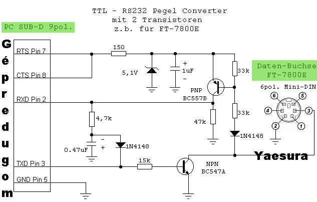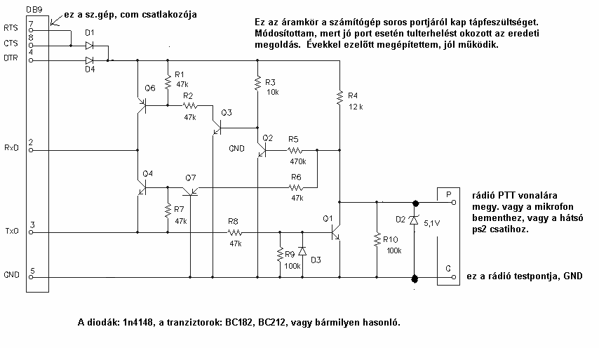 Köszi a pontot. A Szetya kapcsolása is teljesen jó, attól hogy egyszerübb, semmi hátránya nincs. A Z-dióda, elméletileg fontos bele, mert az RS232 szabvány a jelszintváltásra plusz minusz 12 Voltot ír elő, ez nem kompatibilis a TTL (0-5Volt)jelekkel. Ezért kell a Tranziztoros kapcsolásba a Z-dióda, vagy a profibb MAX232 IC-s átalakító, ami megoldja a jelek TTL szintre illesztését. Nálad, ha még mindig kitartasz az USB-s megoldásnál, a helyzet bonyolultabb. Mert szükséged van egy USB- RS232 átalakításra, és még egy RS232 -TTL illesztésre. Ha sikerül szerezned, "gagyibb" USB -"RS232" kábelt, ami a régebbi mobiltelók adatkábele... akkor megspórolhatod a RS232-TTL illesztést. (amiről tettünk fel mindketten rajzot.) Ami persze csak a átalakított telókábel esetén áll fenn. Mert ha igazi soros portra dugod majd a kábelt, aminek esetleg DB9 Cannon vége van, vagy kifogsz egy igaz USB-RS232 átalakító kábelt, akkor a rádió hisztizni fog TTL jel illesztés hiánya miatt (nem szeretik a PTT vonalon a negatív feszültséget.) Szóval az alábbi áramkört, érdemes megépítened, mert sose tudni mikor kerül elő egy igaz COM port. (gondolom sejted, hogy ezek a tranyós áramkörök nem oldották meg a gondodat. Mert ezekkel még mindig nem fog menni közvetlen USB kapcsolatról a rádió kell oda az általam fotózott áramkör, amit a sz.gép kommunikációs portként ismer fel. )