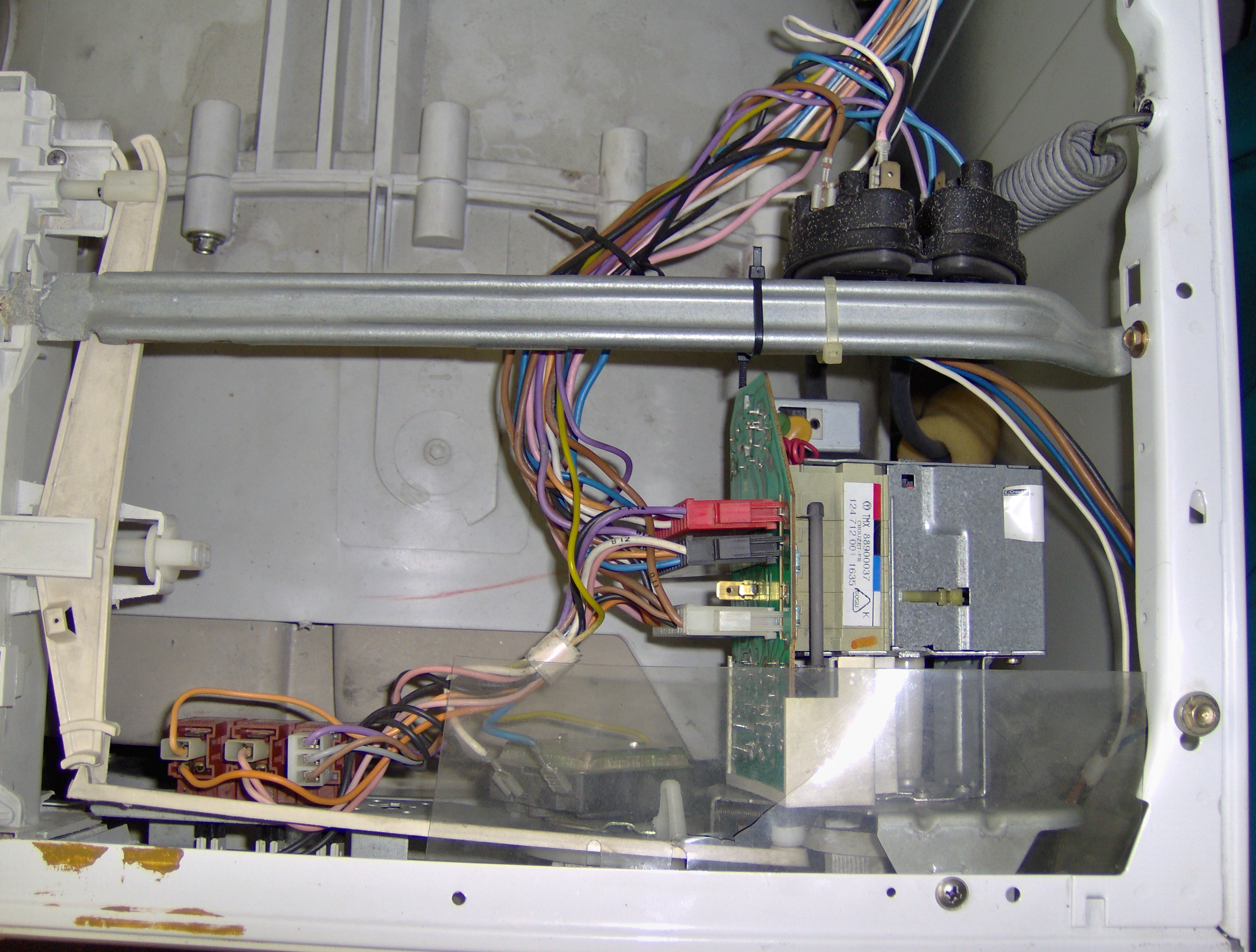 Én is ilyen hibával küzdöttem, nekem a képen bekarikázott cső volt eldugulva, ami a vízszintkapcsolóra megy, tele volt mosószermaradékkal.