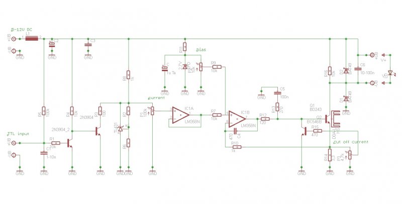 alacsony szintre kioltanak,magasra ráengedik az áramot a diódára. A rövidzár is alacsony szintet képvisel. Ezért ha nincs a TTL bemeneten semmiféle jel,a lézernek sugárzania kell,mert van egy belső felhúzó ellenállás ami feszültséget ad a bemeneti fokozatnak. Könnyebb megértésért mutatok egy képet:TTL laser driver A bemeneti tranyó bázisát egy 100k ohm felhúzza nyitásra,ami a második tranzisztort blokkolja igy a referencia TL431 tud program feszültséget adni az áramgenerátorra. Ha a bemeneti tranyó bázisát rövidre zárod,vagy 0.7V környéki jel van rajta,a jelenség forditott lesz igy a TL431 ref A/K-ja rövidre zár igy nem lesz program jel az áramgenerátornak.
